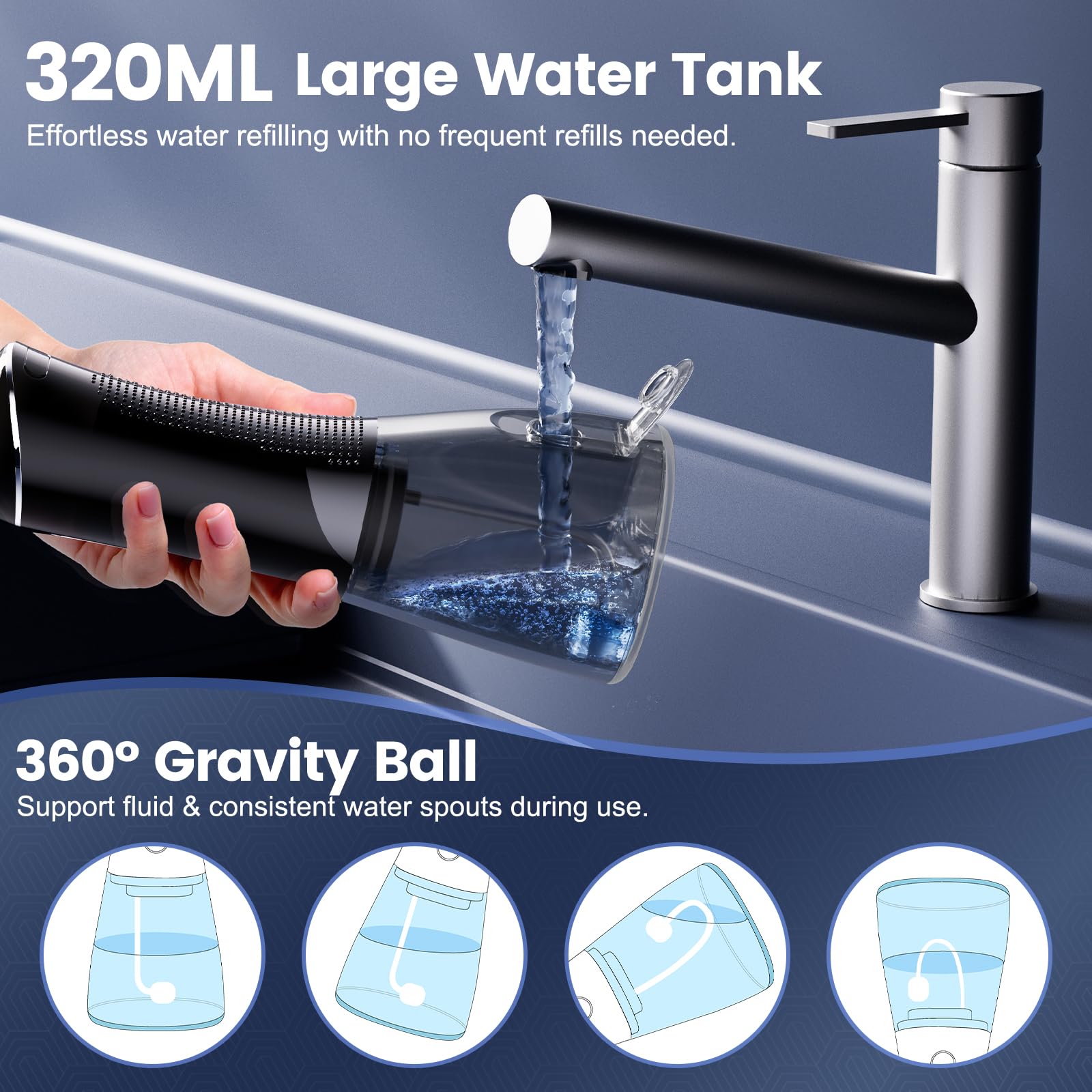 - 320ML Tank And IPX7 Waterproof: The 320ml water tank eliminates the need for frequent refilling and provides a thorough oral cleaning in a single fill. IPX7 waterproof technology makes it easy to clean and use in the shower.